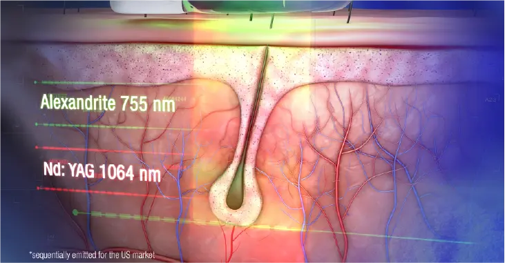 さまざまな肌色・毛質に対応。1回で2種類の波長(アレキサンドライト 755nm/